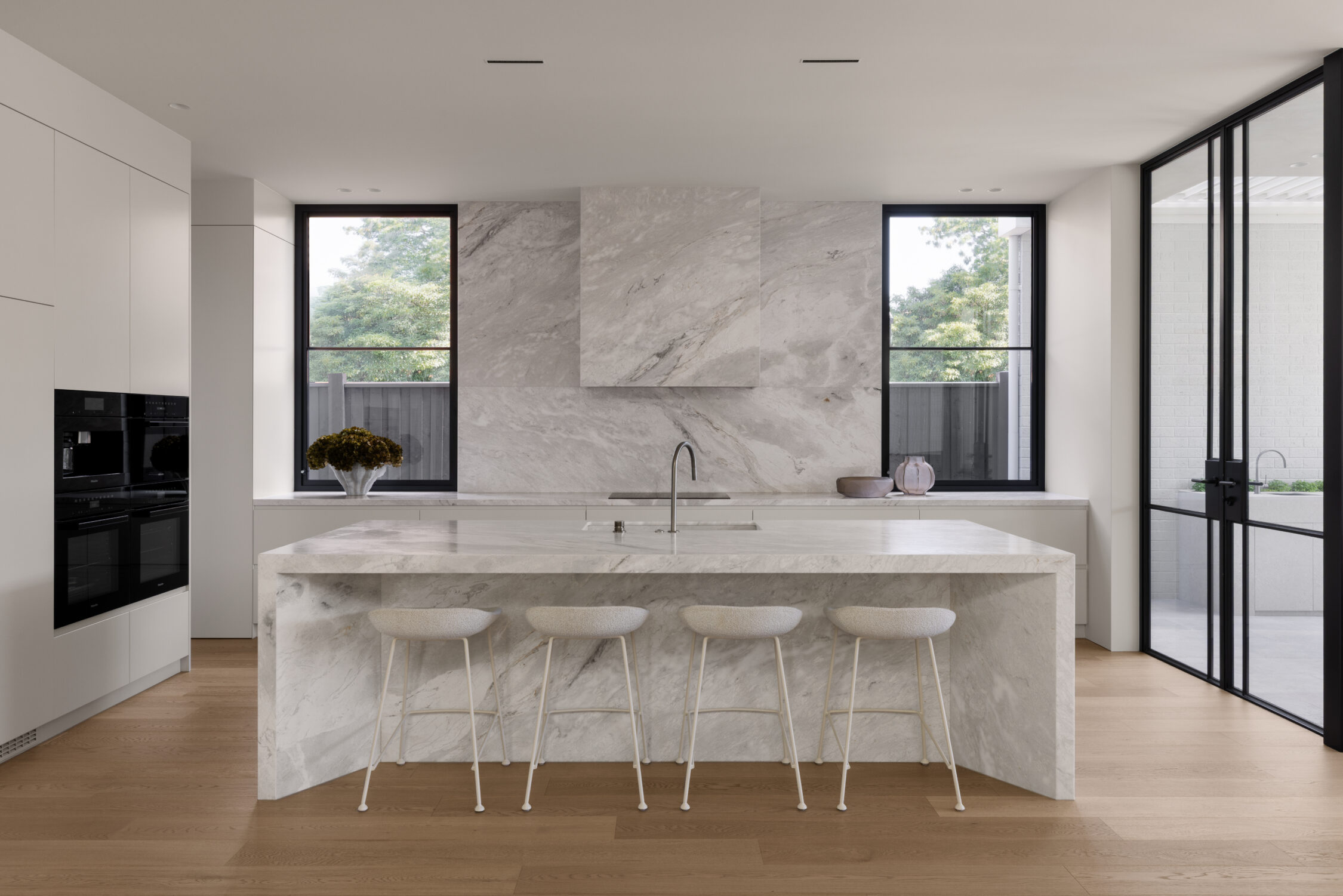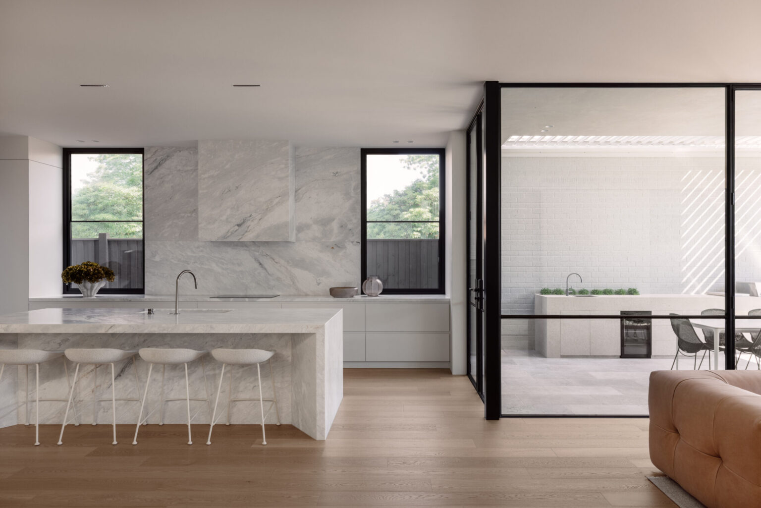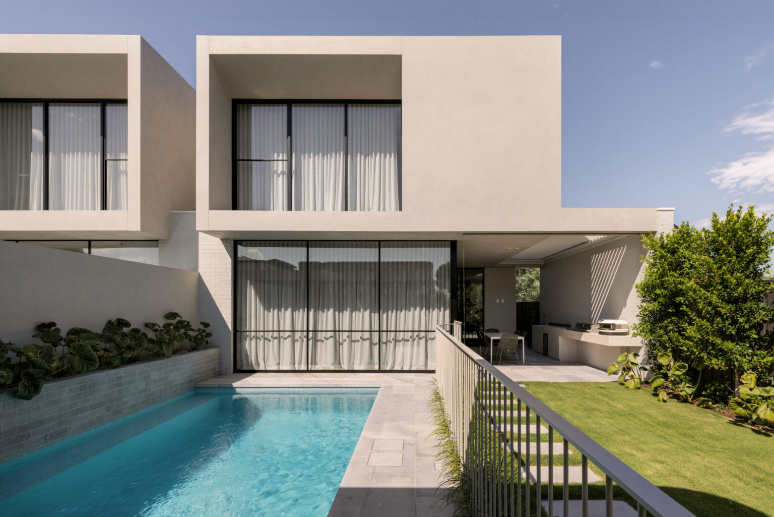 This same discipline carries through to the exterior. Strong forms define the façade, softened by curves and grounded by a restrained palette, including English Walnut stained Accoya timber battens.
